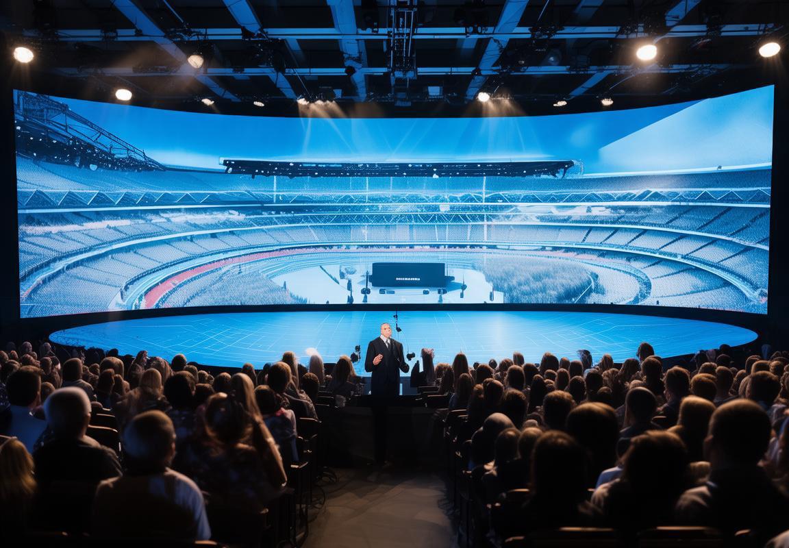 随着老板的话语,现场的大屏幕上开始播放一段段动画演示,一幅幅未来感十足的场景跃然于大屏幕之上。观众们仿佛置身于一个虚拟与现实交织的世界,新主场的轮廓逐渐清晰。